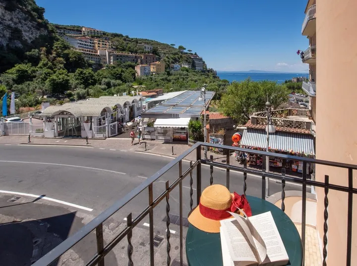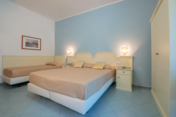 Bright and spacious family room with a private bathroom, ideal for families or groups. The room is equipped with air conditioning and a satellite TV for maximum comfort. The balcony, furnished with a table and chairs, provides a pleasant space to relax outdoors. A crib is available upon request.